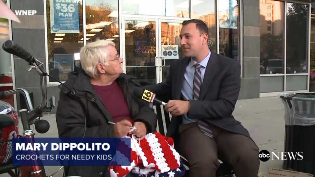 Dippolito crochets for 40 hours a week, making everything from afghans to hats. She sends them to local catholic social services that then distribute them to needy kids to help them get through the long, harsh Pennsylvania winters.