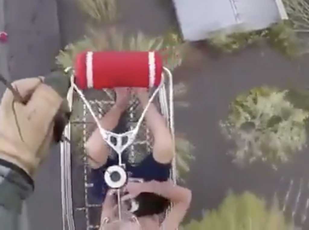 After they spotted the man and his furry friend, two rescue swimmers — Samuel Knoeppel and Randy Haba — jumped to action to save the pair. The rescuers were lowered down to a roof near where the van was floating.